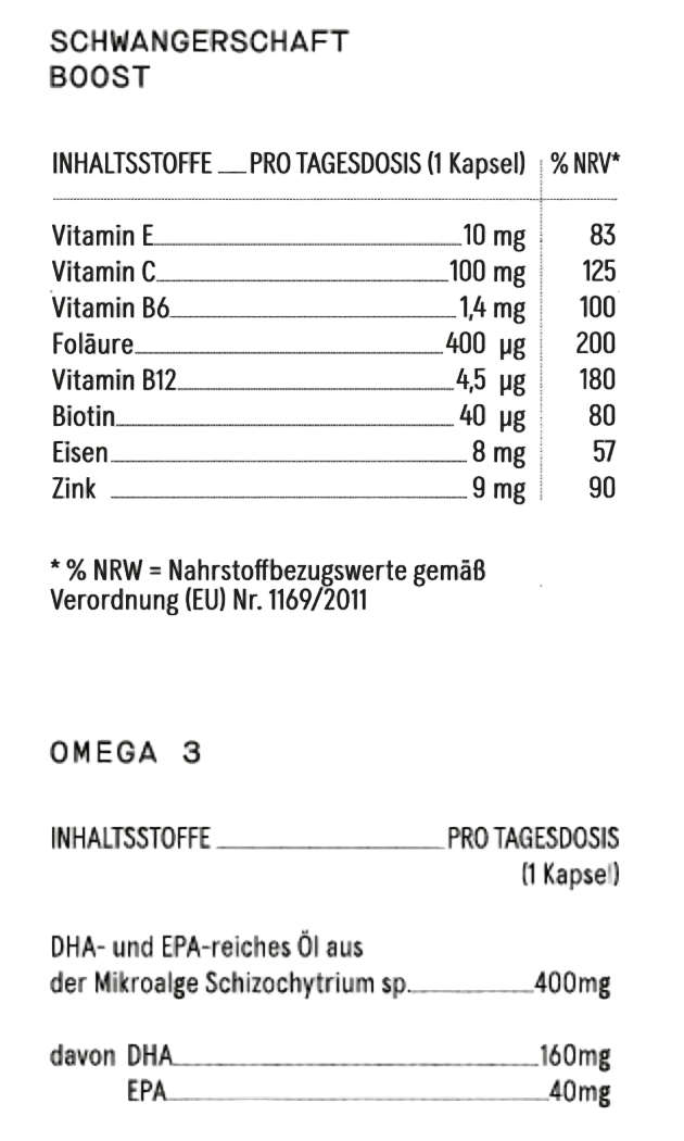 → Wir verwenden die bioaktive, besonders gut verfügbare Form Quatrefolic® (4. Generation). - Omega 3 DHA + EPA aus Mikroalgen (Schizochytrium sp.) - DHA trägt zur normalen Entwicklung des Gehirns und der Augen beim Fötus bei. Das Set liefert dir 450 mg pro Tag gemäß DVO (EU) 2017/2470 für Schwangere und Stillende, rein pflanzlich und umweltfreundlich.